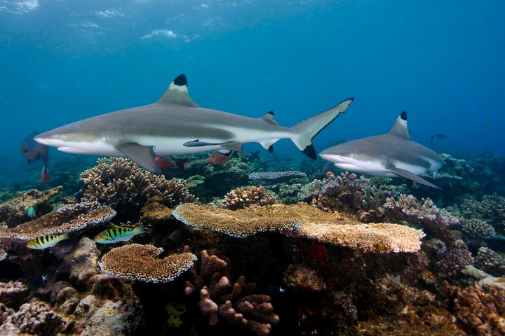 A pair of blacktip reef sharks, one of the top predators on the reef.