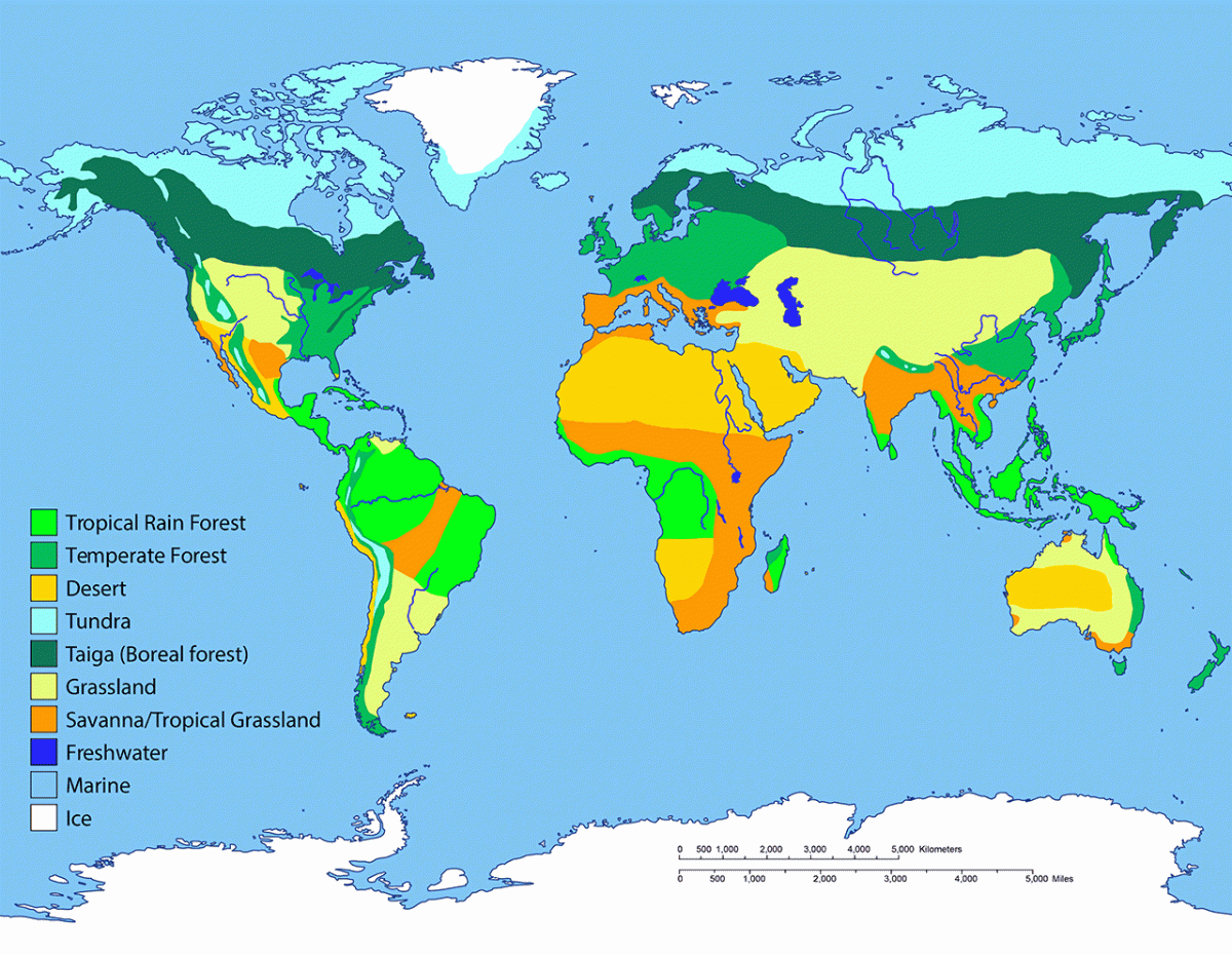 A map of the world showing the basic biomes (https://askabiologist.asu.edu/explore/biomes )